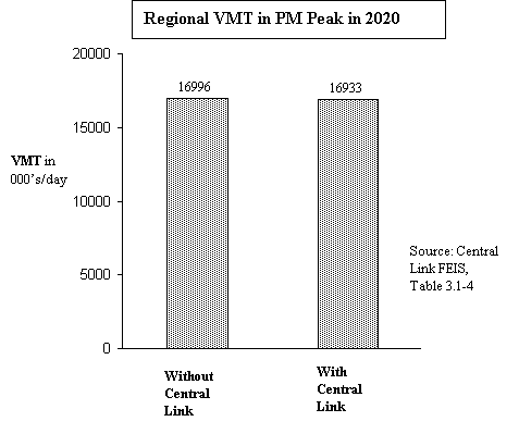 Polls consistently show that traffic congestion is one of the public’s highest concerns.  Link was sold to voters by implying it was a solution to traffic congestion.  Yet Sound Transit’s own studies prove Link would have almost no effect.  The FEIS for the 21-mile Central Link shows that the $2.6 billion (in 95$) system would only reduce road traffic about 1/3 of one percent.  This is equivalent to taking two and a half cars off a lane on 520 that is packed bumper to bumper with cars from Montlake to the east shore of Lake Washington.  It’s hardly noticeable, as the bar chart below illustrates.