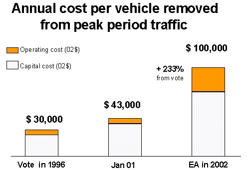 The chart below shows how much this particular cost metric increased from the time voters approved Link.  The left bar is based on Central Link costs at the time of the vote.  The center bar is based on Central Link costs after Sound Transit admitted having underestimated them and raised Link’s cost by $1 billion in Jan 2001.   The right bar is based on Link IS costs as reported in the Feb. 2002 Environmental Assessment.