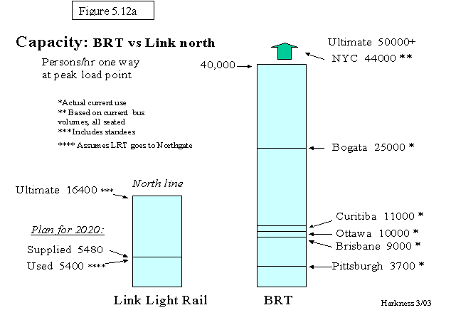 4)  ST and RTP dismissed bus alternatives largely on false claims that buses lacked adequate capacity.  Their analysis was deliberately manipulated to support these claims.   BRT has more than adequate capacity to meet the region’s long-term needs.  Light rail has less capacity than BRT and is therefore less strategic.