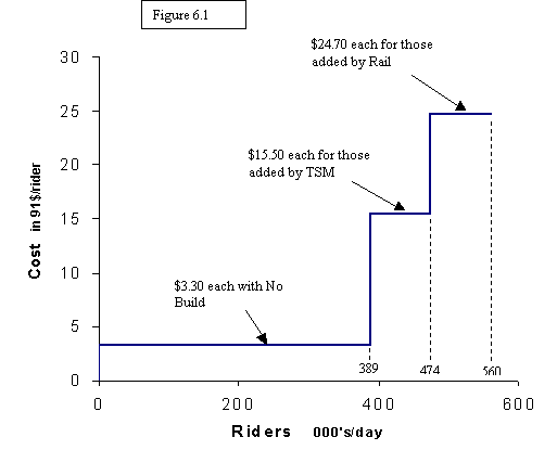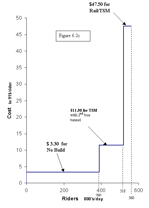 Presenting the data with a chart like Figure 6.2a is useful because it graphically suggests the following: Why not just intensify or extend the TSM alternative until it achieves the same ridership as rail, because it looks as though the savings would be worthwhile?  In other words, whatever we were doing in the TSM alternative, just do more of the same.  In practice this would have meant more frequent bus service, more routes, and perhaps more HOV lanes, direct access ramps, and park & ride lots.   The arrows suggest this idea.  RTP staff was aware of this option and had already estimated its cost.