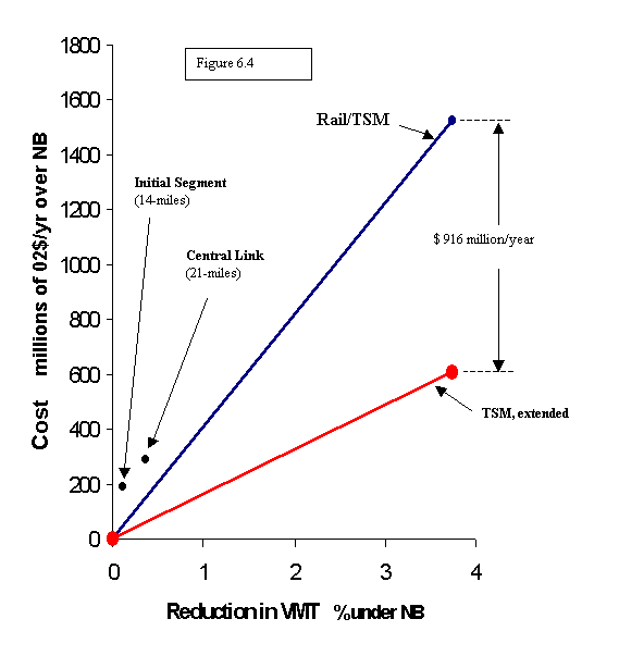 Figure 6.4 is based on conservative assumptions.  For instance the author assumed that a 125-mile light rail system would attract the same ridership as the 125-mile rapid rail system studied by RTP.   Actually, light rail would probably attract fewer riders since it’s slower.  On the cost side, Figure 6.4 is based on light rail costing an average of $120 million/mile whereas Link IS is actually costing $138 million/mile and Central Link is expected to cost $158 million/mile. (All these are in 02$)  Also, it was assumed that the all-bus alternative would require a second bus tunnel costing $600 million (91$) through downtown Seattle, although the existing bus tunnel may well suffice, and if not there are probably less expensive remedies than a second tunnel.  In other words, the Rail/TSM line in Figure 6.4 is probably steeper than shown, the TSM line is probably flatter, and the difference between them is probably greater than $900 million/yr.