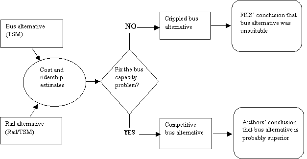 The flowchart reads as follows.  The RTP started by designing an all-bus alternative called TSM and a 125-mile rapid rail plus feeder bus alternative called Rail/TSM.   Consultants then estimated the cost and ridership for each alternative.   At that point it became apparent that predicted bus ridership would exceed RTP’s assumption for tunnel capacity.   RTP elected not to fix the capacity problem using any of the remedies that staff had previously identified.   This resulted in a crippled bus alternative being compared against the rail alternative, and thence to RTP’s conclusion that buses couldn’t meet the regions needs, whereas rapid rail could.